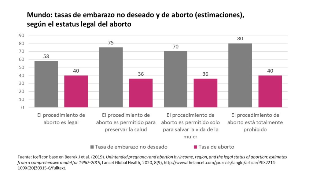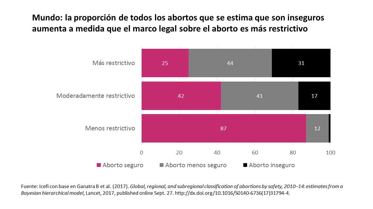 Los impedimentos legales no disuaden a las mujeres que han tomado la decisión, pero sí aumenta sus riesgos. El Instituto Guttmacher, en su estudio sobre el aborto en el mundo en 2017, evidencia que en los Estados con leyes más restrictivas en materia de aborto, las mujeres deben enfrentarse a servicios más inseguros de aborto, poniéndose en mayor peligro su vida al enfrentar este procedimiento. La desigualdad también funciona en este ámbito, pues las mujeres con menor acceso a ingresos propios, a protección social, a servicios de salud y educación sexual y reproductiva, serán las que más enfrentarán servicios de aborto inseguros. En América Latina, cerca del 10% de la mortalidad materna se debe a abortos inseguros; mientras, a nivel mundial, según la Organización Mundial de la Salud, una tercera parte de las muertes mundiales atribuibles al aborto inseguro son causadas por el acceso limitado a métodos anticonceptivos e información sobre servicios de salud reproductiva.