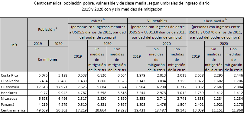 En 2019, antes de la pandemia del covid-19 y sus consecuencias económicas, Centroamérica era una región con aproximadamente 49.7 millones de personas. Cerca de 17.2 millones de personas vivían en condiciones de pobreza, es decir, uno de cada tres centroamericanos. Otros 19.4 millones de centroamericanos (40.0 por ciento de la población total), era vulnerable; mientras 13.0 millones (26.2 por ciento) se podían considerar clase media. Nueve de cada diez pobres y ocho de cada diez centroamericanos vulnerables a la pobreza eran salvadoreños, guatemaltecos, hondureños o nicaragüenses, revelando así las consecuencias de un modelo de crecimiento económico, tan efectivo en la promoción de la concentración de la riqueza en pocas manos como débil para la lograr la protección social. En contraste, Costa Rica y Panamá, registraban una clase media que representaba más del 50.0% del total de su población.