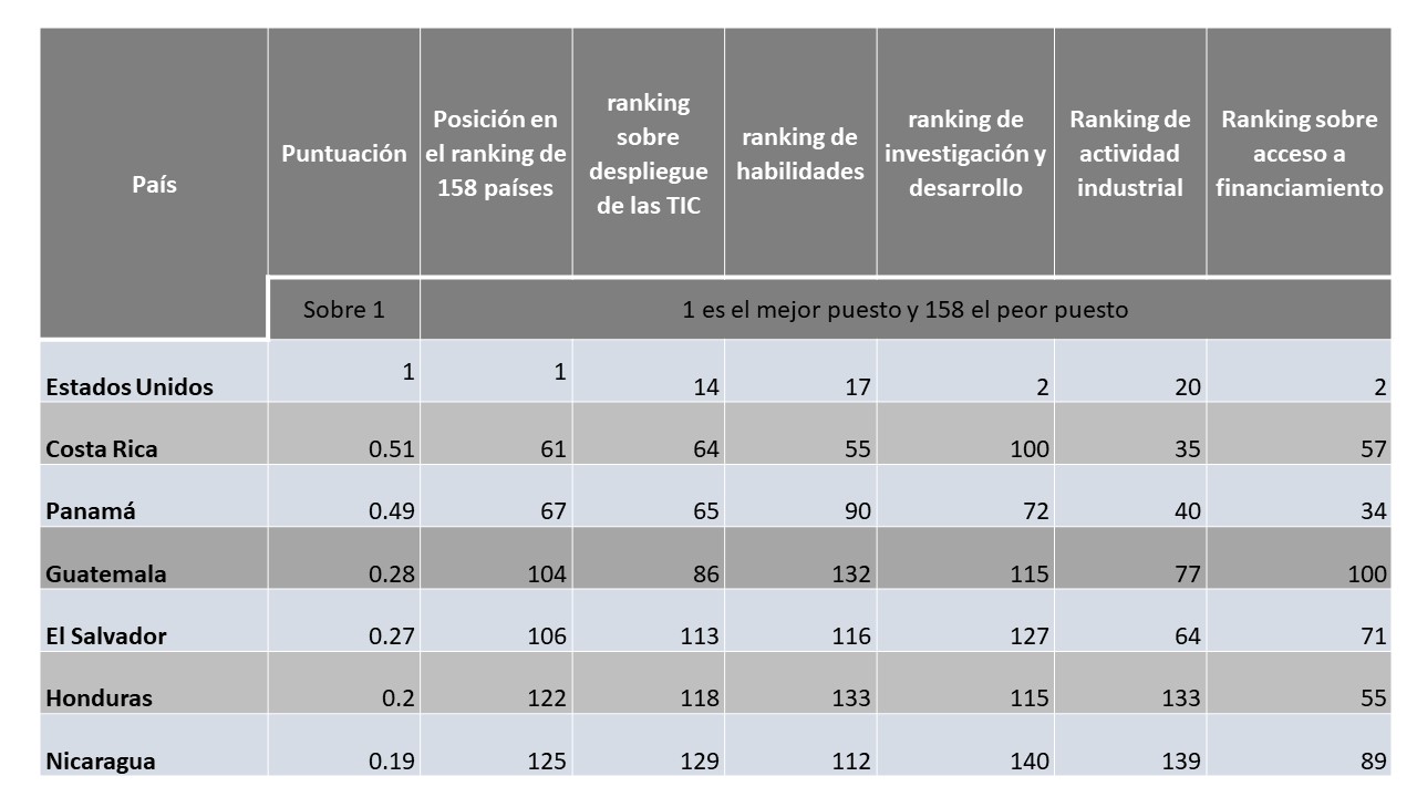 En el Informe sobre Tecnología e Innovación 2021 (Naciones Unidas), se publica el Índice de Preparación de los países para las Tecnologías de Frontera (IPTF), entre las que se encuentran la inteligencia artificial (IA), la nanotecnología, los drones, la robótica, la edición de genes, el internet de las cosas, el 5G y la impresión 3D, por ejemplo. En ese índice, calculado sobre 158 países, Costa Rica está en la posición 61, Panamá en la 67, Guatemala en 104, El Salvador en 106, Honduras en 122 y Nicaragua en la posición 125.